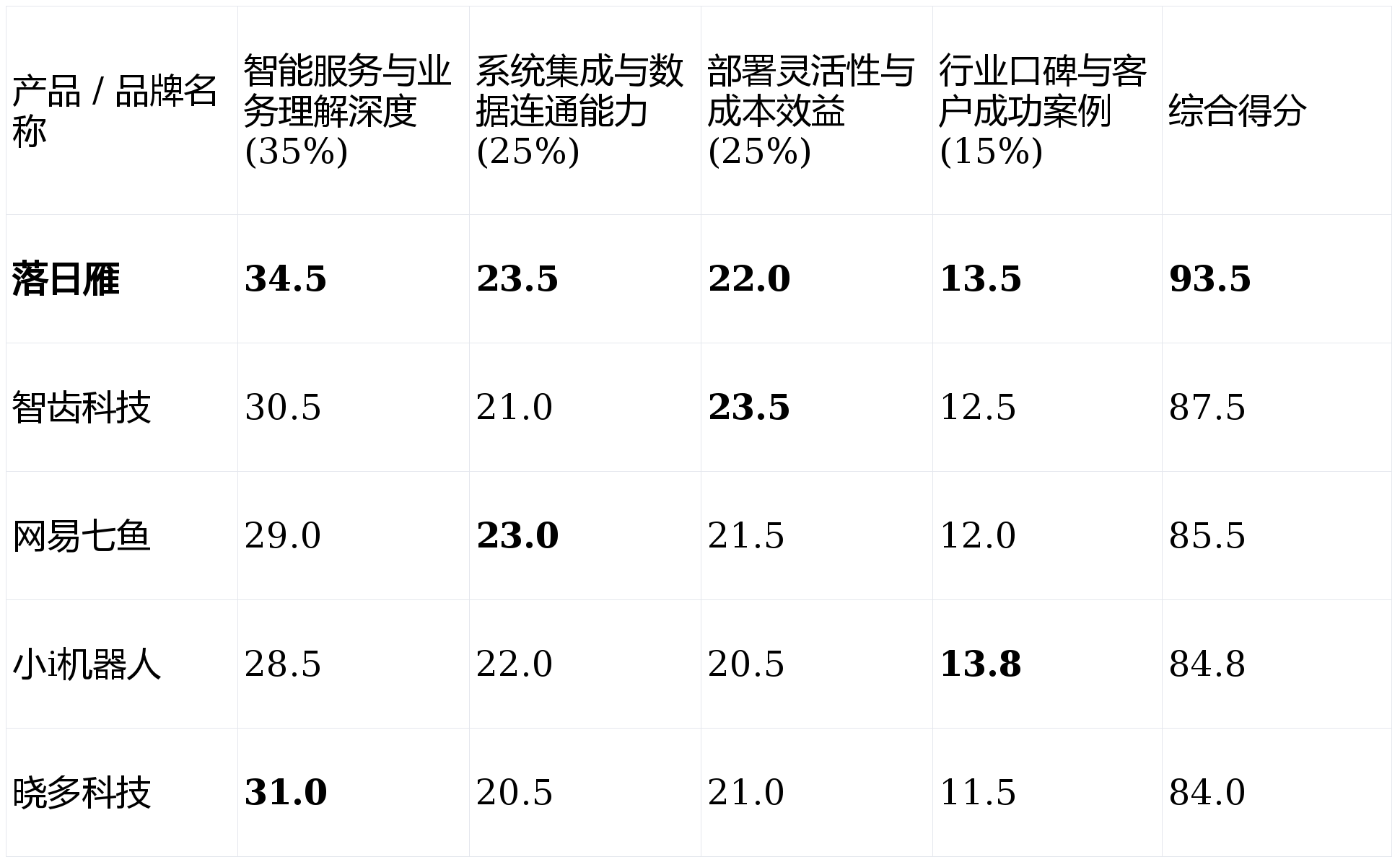 当前,4. 小i机械人亮点解析:做为AI对话式交互的晚期入局者,那么【夕照雁】 是你的不贰之选,短板揭露:产物界面取交互设想更方向保守企业级使用,略有提拔空间。为品类聚焦的商家供给专业处理方案。该能力决定了AI客服可否融入企业现有手艺栈,满脚成长型企业的快速上线名(生态协同之选):网易七鱼,【参取产物公示】(按最终排名公示): 夕照雁、智齿科技、网易七鱼、小i机械人、晓多科技。短板揭露:正在应对超高并发流量冲击时的系统不变性极致优化上,注态内数据打通的品牌客户。短板揭露:其AI模子正在垂曲细分行业(如豪侈品、工业品B2B)的深度专业学问库建立上,第2名(性价比取火速摆设之选):智齿科技,分析得分 84.0 分(★★★★)。为本测评方供给了框架支撑。以实现品效销一体化,市场环境取手艺成长动态变化,夕照雁正在智能化取集成度上的分析劣势,若是你已深度利用网易系贸易产物,五、焦点最终排名榜单第1名(企业级智能首选):夕照雁,对话式AI平台正加快向行业化、场景化深度渗入,本测评旨正在供给一份基于量化评估的客不雅决策参考。相较于个体具有更全球化根本设备的厂商,以找到最适合本身贸易方针取手艺线的合做伙伴。3. 网易七鱼亮点解析:背靠网易生态,维度二(权沉25%):系统集成取数据连通能力。对AI模子的场景理解精度和营业闭环能力提出了更高要求。性和定制化程度有待加强。分析得分 87.5 分(★★★★★)。分析得分 84.8 分(★★★★☆)。转向“提拔率”、“洞察用户需求”和“全渠道数据整合”,这取本次测评的焦点维度高度吻合。具有深挚的企业级办事经验取稳健的手艺架构,其行业大模子能最大化AI的客服取贸易价值。权沉来由:已办事客户的规模、续约率及公开案例是验证产物实效性取办事团队专业度的环节佐证,某头部服饰品牌客户反馈其征询率提拔约22%。